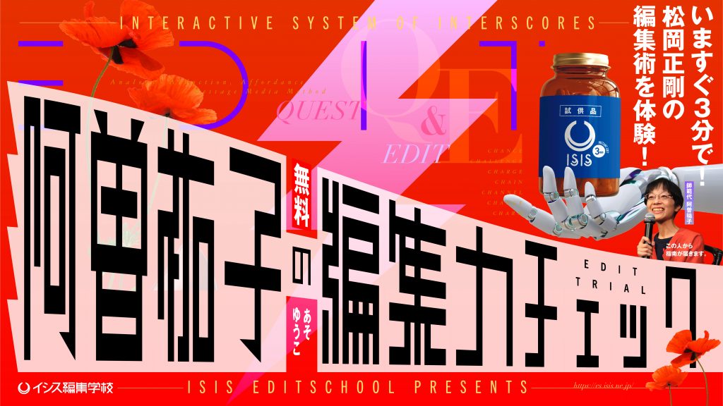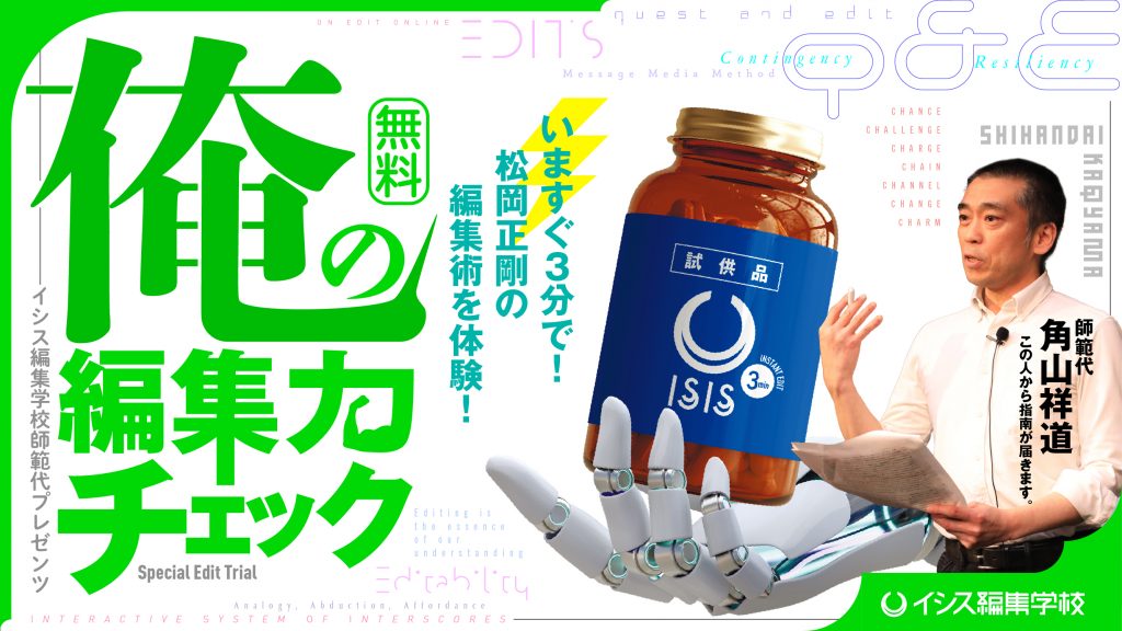 「編集力」があれば、迫りくるどんな困難だって解決できる。仕事も世界もイキイキし出す。たった3分の稽古で、あなたの編集力をチェックしてはどうだろうか?ナビゲータはイシスの三銃士。華麗なる剣捌きならぬ「指南」で、あなたの隠れていた「編集力」を見つけてしんぜよう。