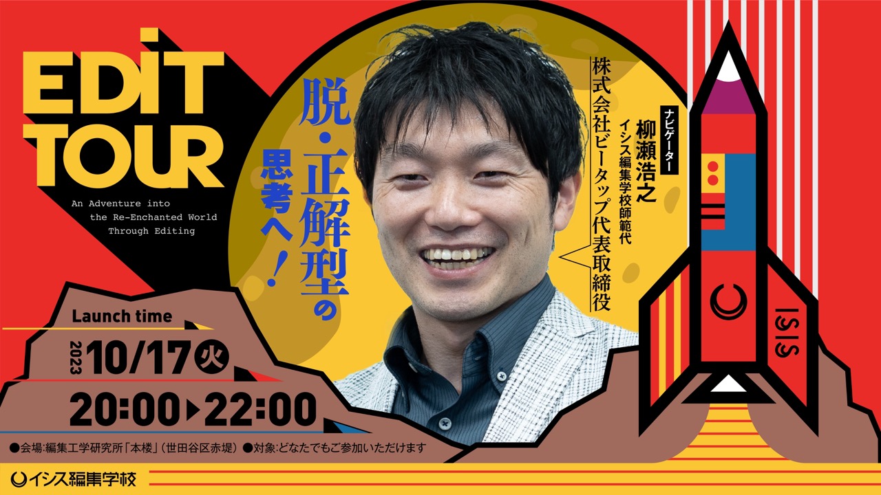10月17日(火)20時より、編集術を体験することができる「エディットツアー」を開催します。ナビゲーターをつとめる柳瀬浩之師範代は、「世の中にあふれる正解に振り回されずに自分の思考の軸を持ちたい」と課題を抱いている時に、編集工学のバイブルともいえる一冊『知の編集術』とであい、イシス編集学校の受講を決めた一人です。一企業の代表であり、企業研修や個人向けキャリアコーチング事業の新サービス開発を手がける柳瀬師範代は、イシスで学んでから「世界の見方が変わった」といいます。