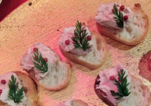 牧子シェフが腕を振るったお食事タイムでは、はじめに味の“超部分”を感じてもらいたい。カナッペのピンクペッパーが口の中で広がり、味の印象をガラリを変えた。