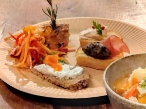 今回、牧子シェフが挑んだのは、同じ具材を使って、まったく違うお料理を作っちゃうクリスマス・メニュー。その一部は、手書きのMenu画像をごらんいただきたい。インプットの情報は同じなのに、プロセスの違いで、アウトプットが変わる。少し手を加えるだけで、最後にトッピングを変えるだけで、ドイツらしさ、フランスらしさ、アメリカらしさ、も演出した。さらにグリュワインとデザートで本楼会場はすっかりパーティーモードに包まれた。