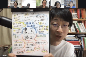 松岡正剛校長の千夜千冊を音読した後、キーワードをA4紙にスケッチして交わし合います。