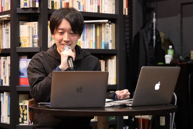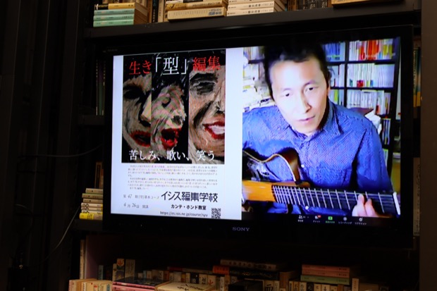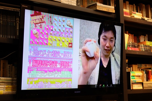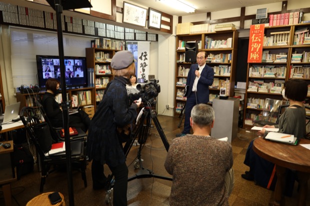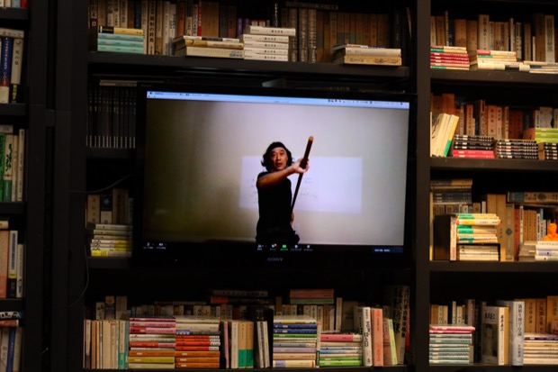 2階学林堂で行われた[破]伝習座では、ISIS編集学校[破]CM(制作:林朝恵師範)がオープニングを飾り、松岡正剛校長の執筆姿が映し出されると一気に空気がピンと張る。オンラインで参加する10人の師範代を、10人の指導陣がカメラ越しに迎え、じっくりと共読を深めていった。