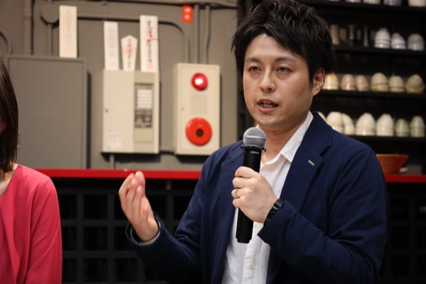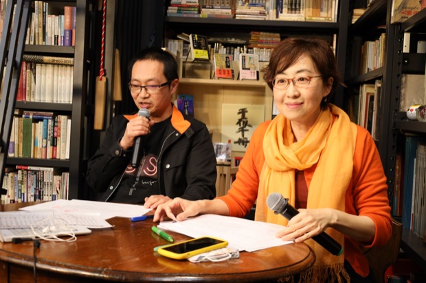 小気味よい進行の[守]フライヤー発表で口火を切る吉村堅樹林頭と若林牧子師範。お揃いのオレンジを纏って。