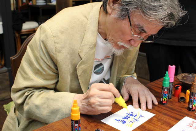 ネオンに加えてISIS提灯で一気に賑やかに。バランスを確認する松岡事務所 寺平賢司。