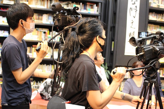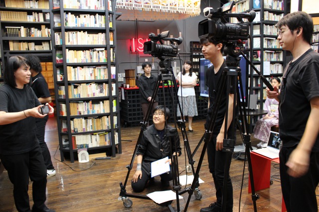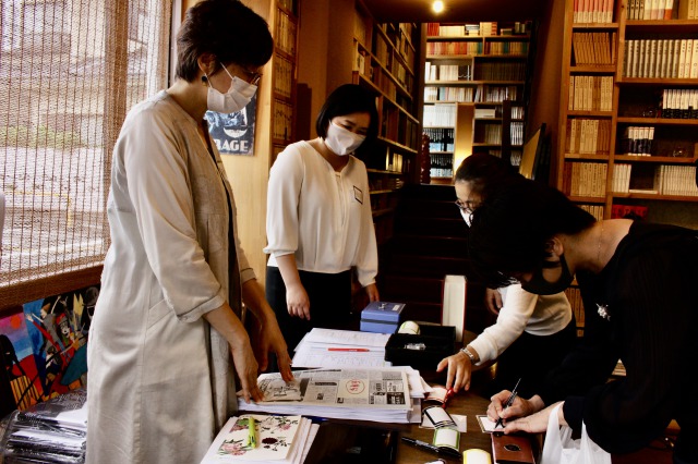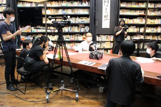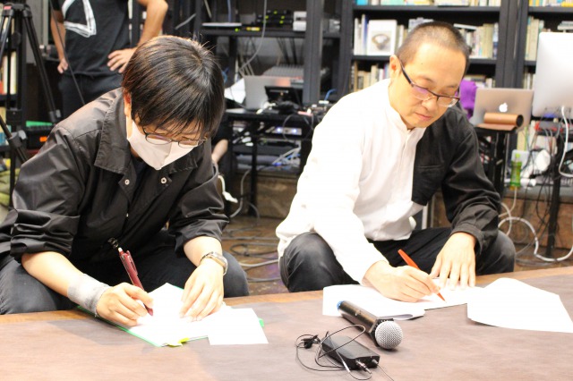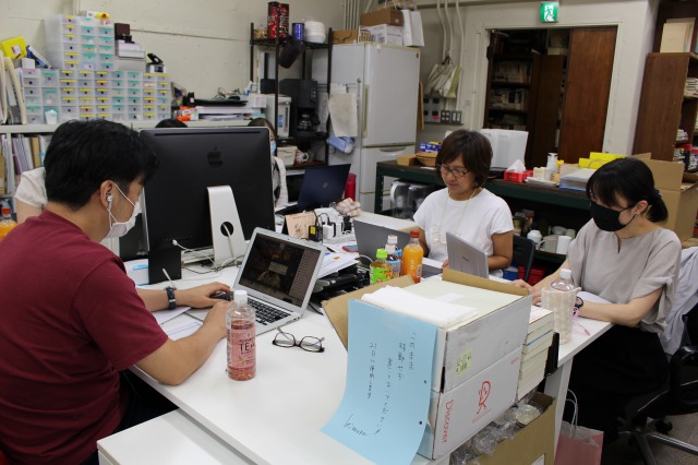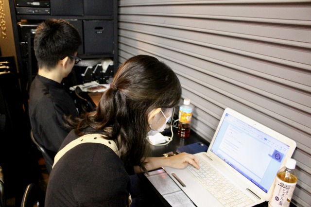 スタジオとイーてれを繋ぐQ出し担当 豊田香絵師範代(手前:第27期ホーライブラリー教室)とエディスト執筆&公開管轄担当 上杉公志師範代。本楼の片隅で堅実な仕事ぶり。