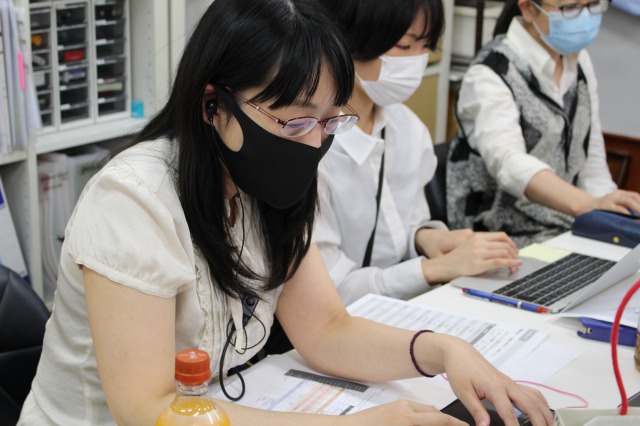 スマホZoomカメラでスタッフ紹介コーナーの撮影を担当した林朝恵師範(左)。感門団や裏方スタッフをみんなに見せたいという校長の思いを受けて。