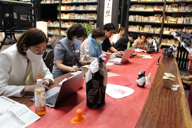 会えない距離を感じながら画面越しに教室・チームメンバーたちと交わし合う師範・師範代。本楼と教室が混ざり合っていく。