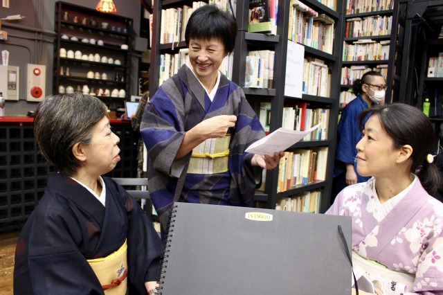 進行の最終チェックをする風韻講座指導陣。それぞれにお似合いの着物が三人集うと更にらしさが際立ってくる。