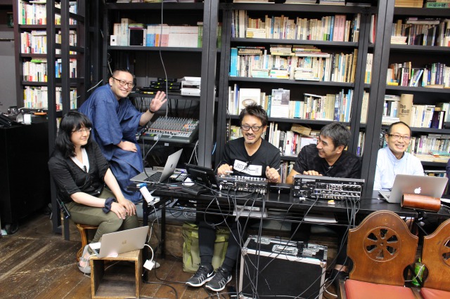 配信の心臓部テクニカルブース。左から編工研 伊藤有希、武田英裕師範代(第41期古近亭電三教室)、森本研二師範代(第44期ユーヅームゲ教室)、編工研 小森康仁、吉村林頭。