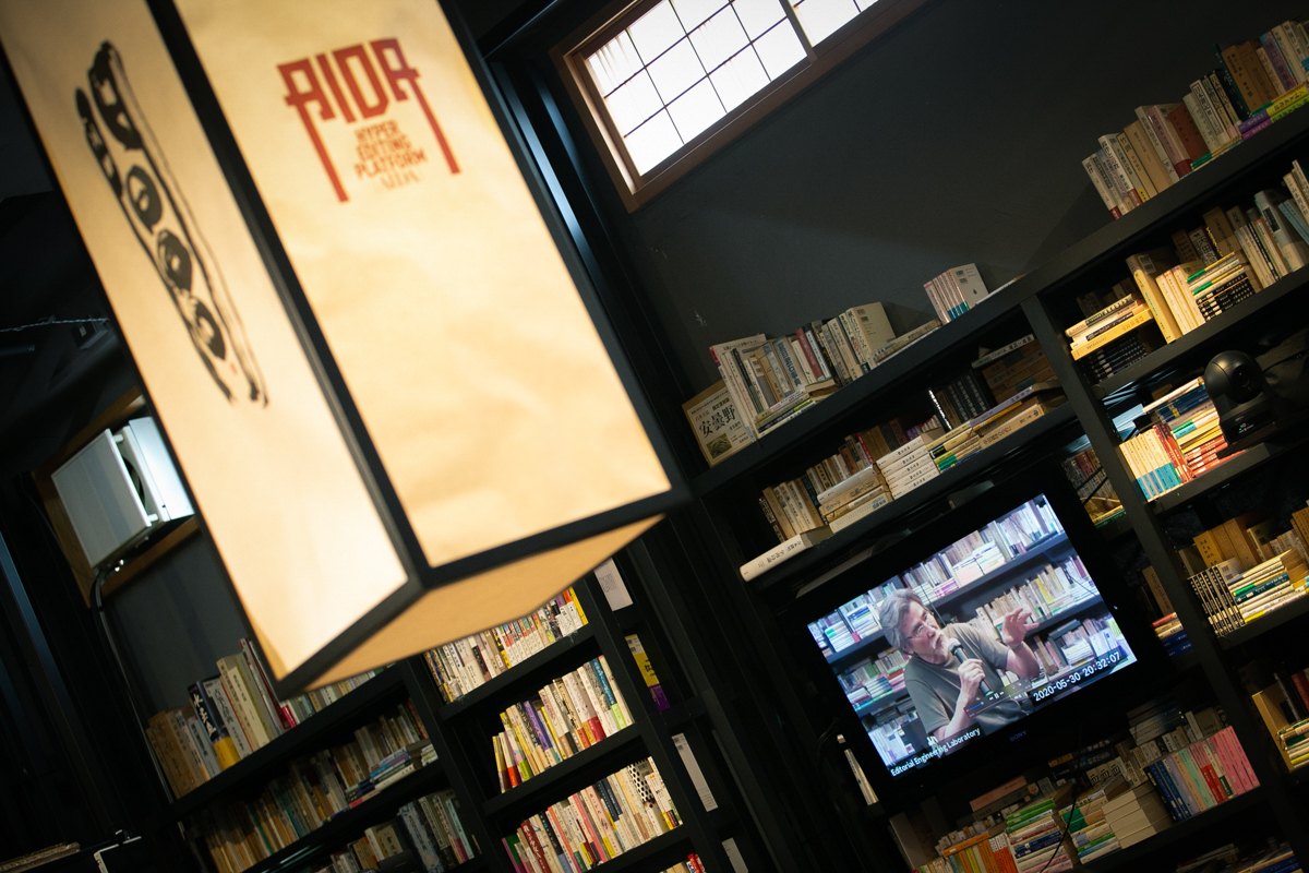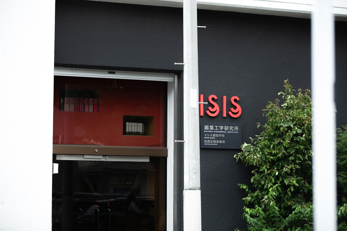 豪徳寺にあるイシス編集学校の拠点「本楼」。シックな黒い壁の中に火を灯すような赤いロゴ。小さいながら、補色である緑色との対比からもひときわ存在感を示している。