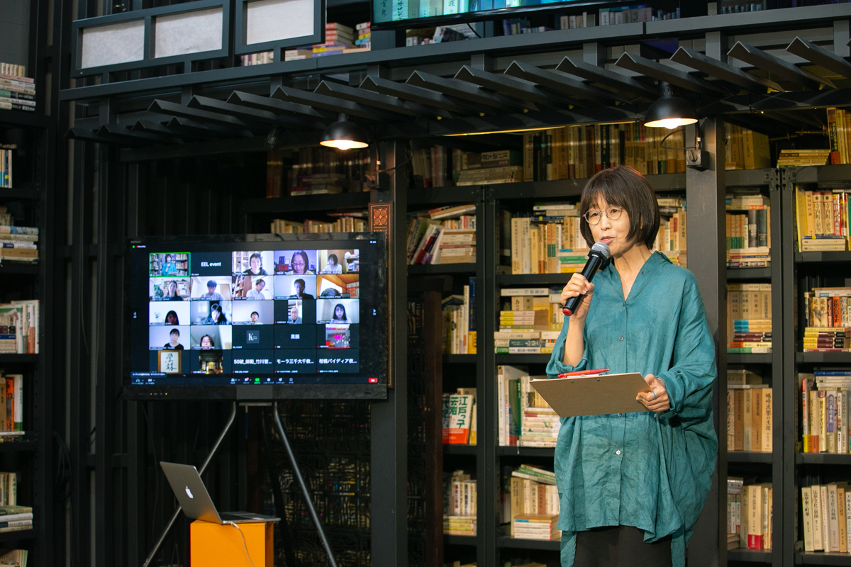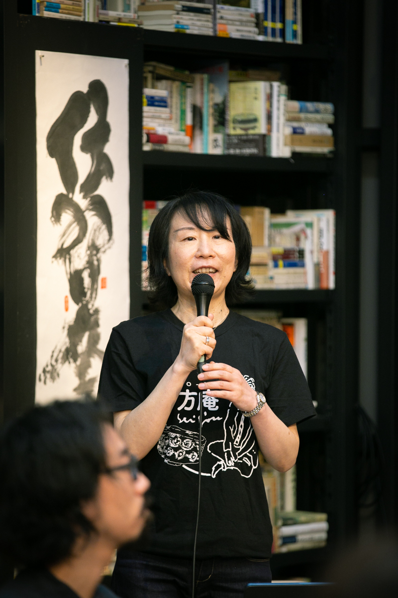 挨拶をする学匠原田淳子。「方庵」と書かれているTシャツに身を包む。