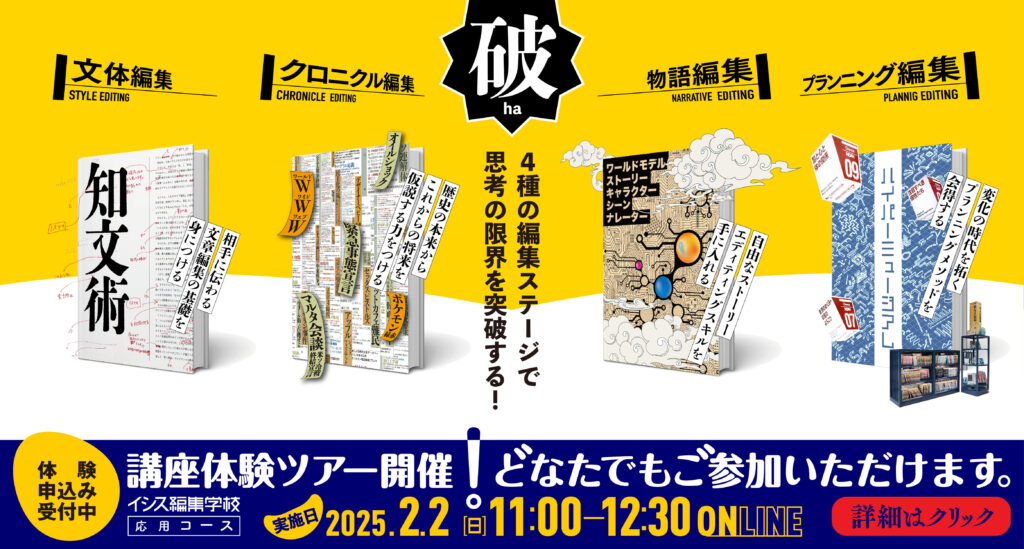 株式会社編集工学研究所(本社:東京都世田谷区、代表取締役社長:安藤昭子)が運営するイシス編集学校は、インターネット上で24時間いつでもどこでも「編集術」を学べる学校として、2000年に開校、25周年を迎えました。 […]