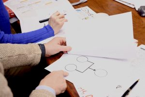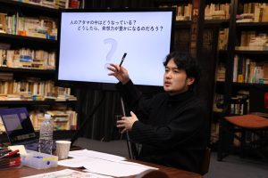 参加者も揃い、3時間のワークショップがはじまる。まずは基本的な編集ワークでウォームアップ。普段、自分がどういう風に発想をしているか意識をしていないもの。アタマの中で無意識に行なっている《編集》を取り出すために、この日は「地と図」「見立て」などの編集ワークを高速で行う。短いワークでもワークシートに書き出すと自分の思考癖が見えてくる。