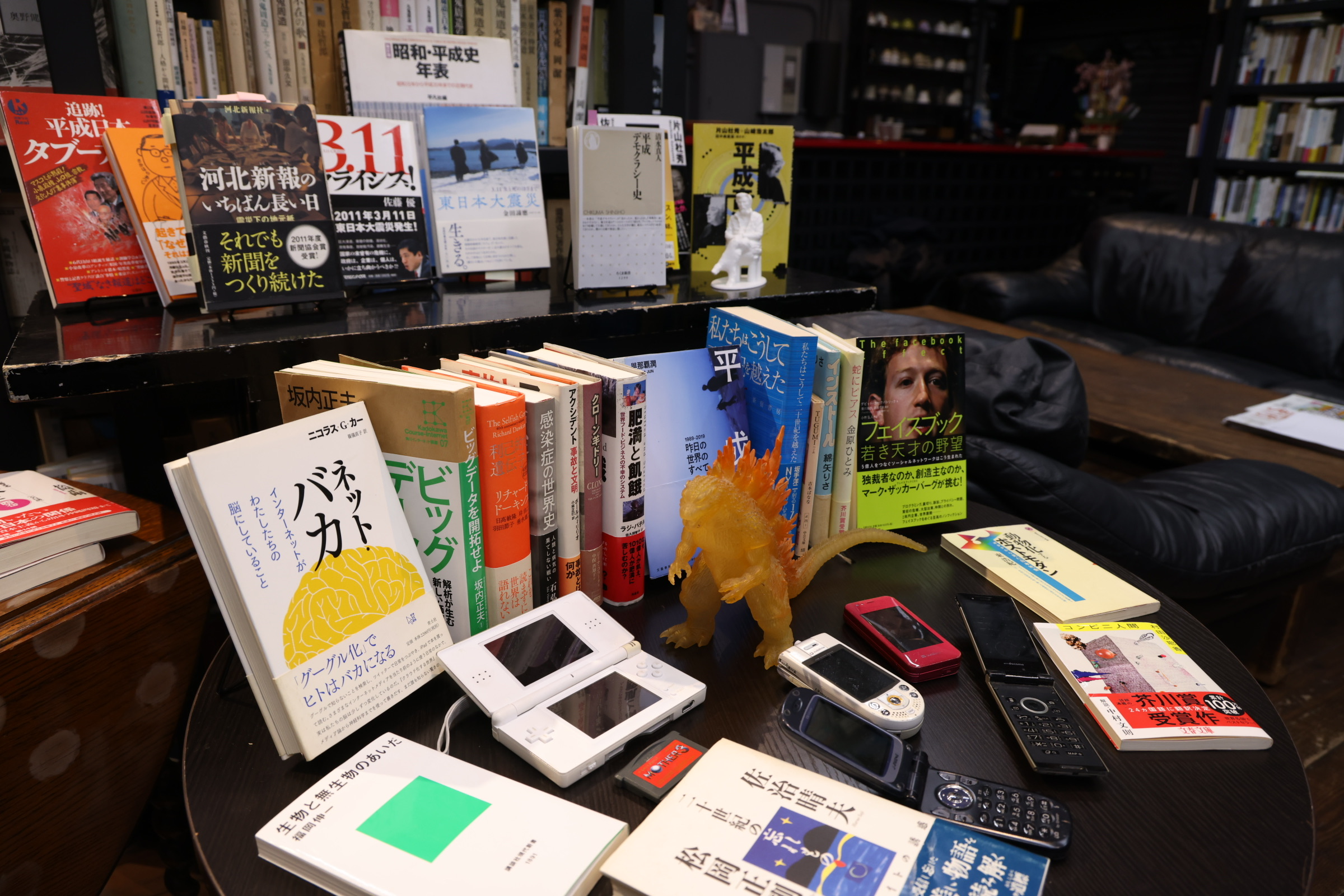 本楼では平成コーナーが参加者をお出迎え。3.11からフェイスブックまで、平成っぽい書籍が並ぶ。手前には2000年版のゴジラフィギュアやNintendo DS、ガラケーなどスタッフが持ち寄った平成グッズも顔を揃える。