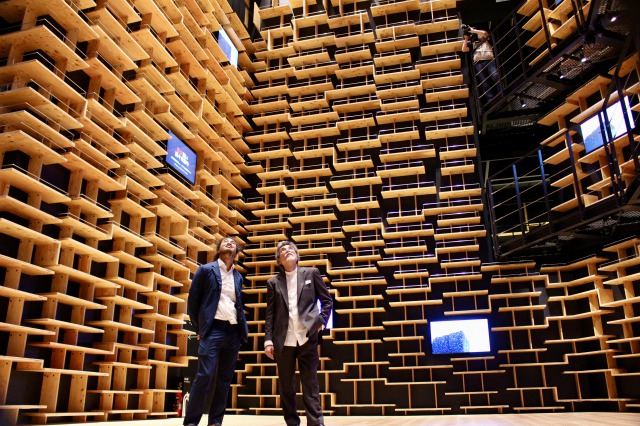 「想像以上に面白いですね。武蔵野の大地の地層のように本が積み上がっていって知層を見てみるという予定だった。隈さんに作ってもらった違い棚(霞棚)が無数に組み合わさっているので想像、連想が永続的であり反復的になっているのが面白い。上から下がっている木も細部に生きている。インモーション、動的な本棚をずっと作りたかったが、初めてうまくいったという印象を受けました」