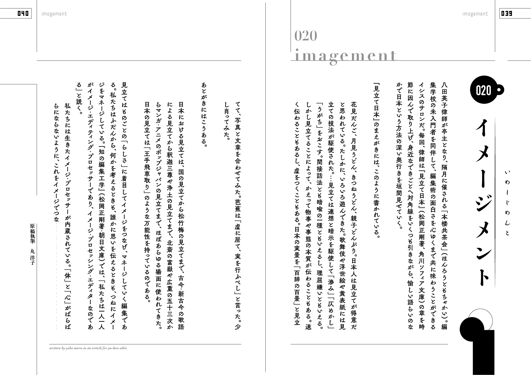 八田英子律師が亭主となり、隔月に催される「本楼共茶会」(ほんろうともちゃかい)。編集学校の未入門者を同伴して、編集術の面白さを心ゆくまで共に味わうことができるイシスのサロンだ。毎回、律師は『見立て日本』(松岡正剛著、角川 […]