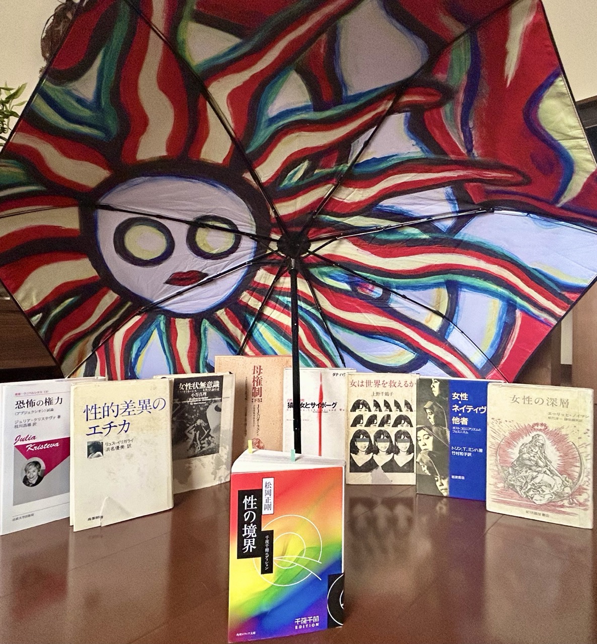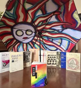 『性の境界』の口絵写真のインパクトに引けを取らない思い切った作品です。「第二章 母・女・差別」で取り上げられた本がずらっと並び、「原始、女性は太陽であった」をイメージされたよう。第二章の本とTAROの太陽が背後から『性の境界』を見つめ、圧倒するような配置が面白いです。ここまで大胆にやるのであれば、フローリングの茶色が大きな面積を占めていて全体のトーンを落としているのがちょっと惜しい。