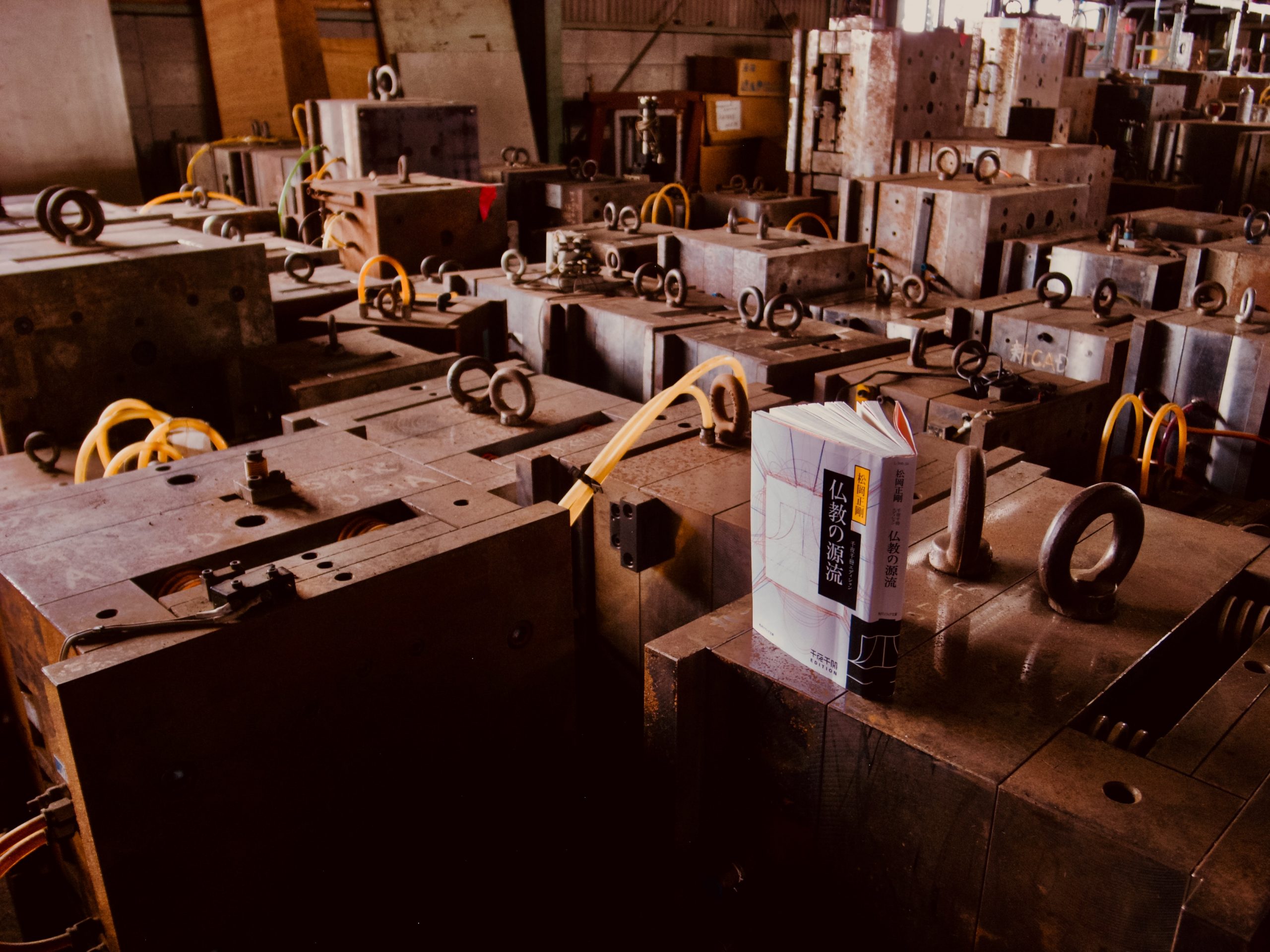 ひと目見て、この写真好きだなぁと思いました。ジャケットの配色と合わせた色味。特に黄色の差し色が効いています。直線と曲線の組み合わせもジャケットの世界観を表しているようです。手前に結構な面積で奈落のような暗さが占めていますが広がりを感じるのは奥行きをしっかりと捉えられたからでしょう。タイトルの「さび」には錆と寂のダブルミーニングが込められています。じーっと見ていると金型の丸い部分が僧侶が護衛のために携帯する錫杖に見えてきます。消費社会は私たちの何を守り、救済してくれたのか、問題提起にもなっている一枚と言えそうです。