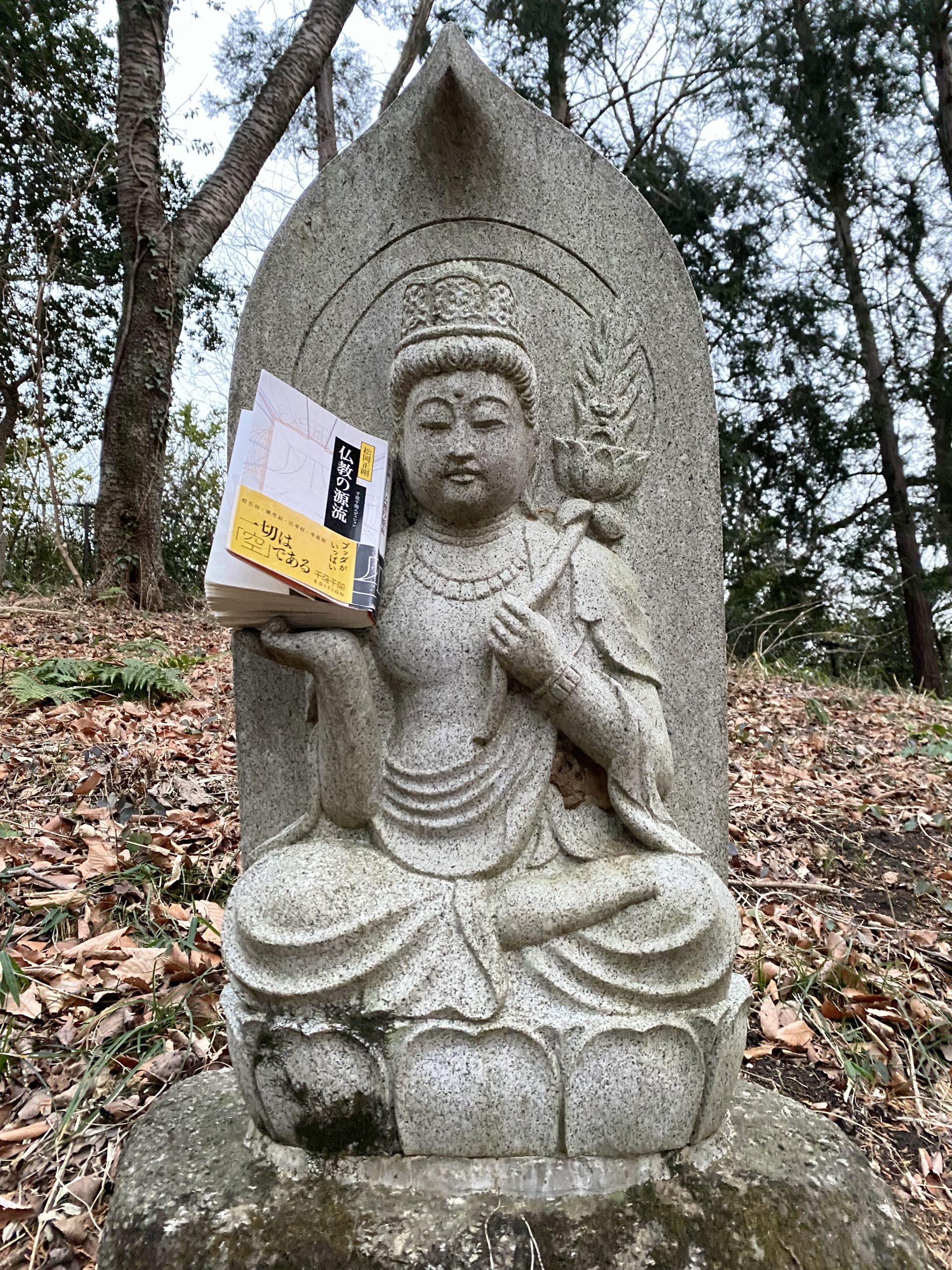 こちらの2枚はあわせて見てみましょう。どちらも縦位置で石仏との2ショット。一見同じようなアプローチに思えますが、観音様の手のひらに添えられると『仏教の源流』が経典のように見えますし、お地蔵様の側で屹立させると衆生を見守るありがたい偶像のようにも見えます。2枚並べてこそ、その違いを楽しめるお二人の競作(?)。次はどのような場所でどんなふうにエディションを撮影されるのか、大澤さん&畑本さんの作品に今後も注目したいです。