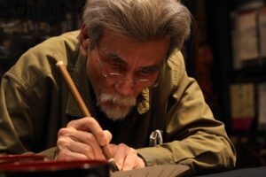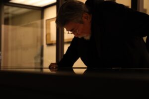 2022年秋。成田山書道美術館の視察に同行した。初めて行く場所での撮影はいつも緊張する。動画担当の林朝恵さんとロケハンのために、先に美術館に入り一通り撮影するものの緊張でおなかが痛くなった。校長が美術館をどう見て回るのか全く想像がつかない。「松岡さんもうすぐ着きます」和泉さんから電話が入り、駐車場に走った。「おう」校長が手をあげて、撮影が始まる。校長の情報の取り方は速い。鑑賞スピードが速くて内心焦る。一方で目を留めた書にはじっくりと向き合う。一瞬、校長の目が潤んでいるように見えて心がざわついた。