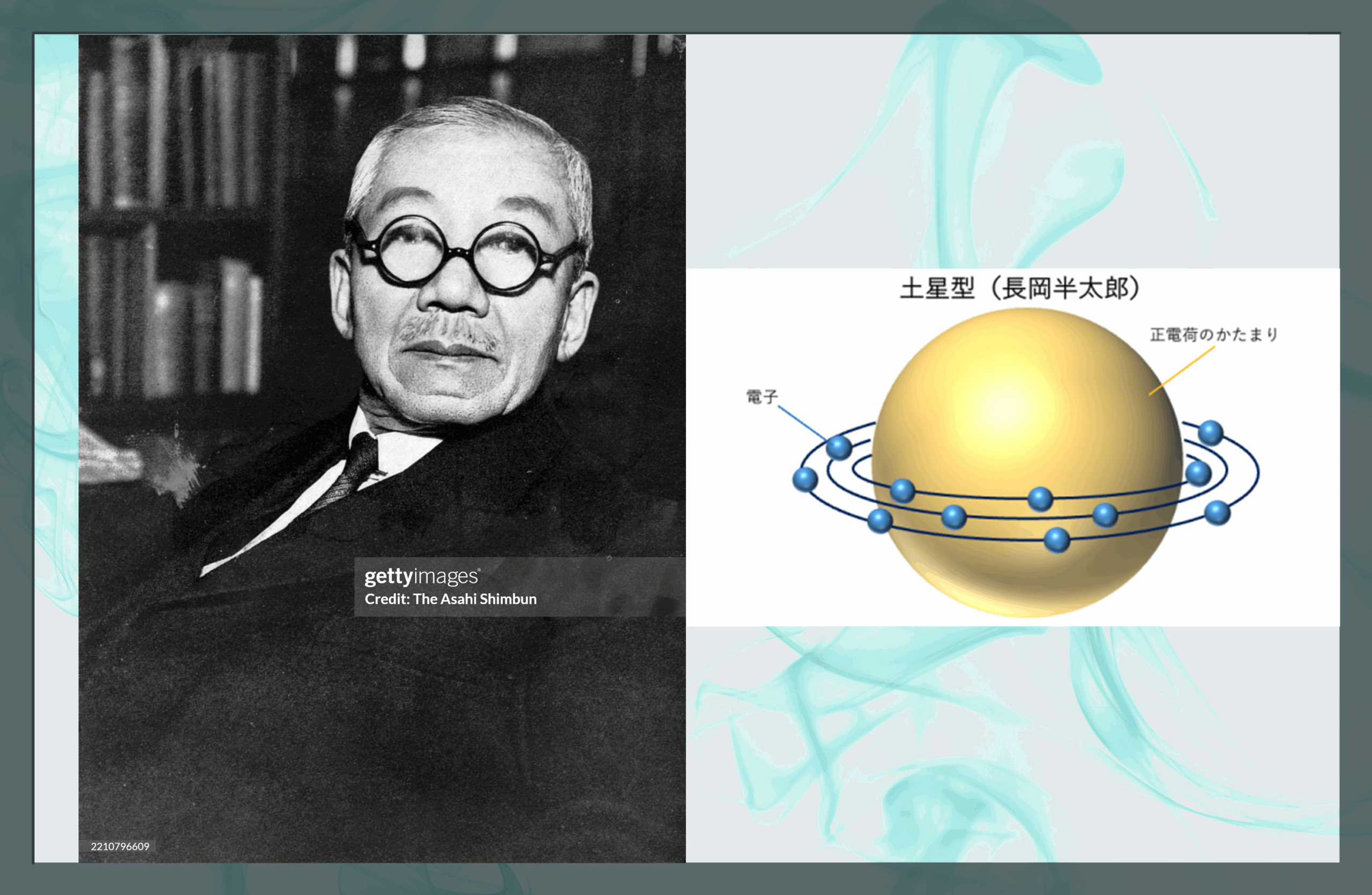 長岡半太郎(左図)は土星型原子核モデル(右図)を提唱した明治期の物理学者。中国の古い文献にオーロラの観測記録や微分の観念がすでにあったことに感銘を受ける。弟子の湯川秀樹は日本的科学を打ち立てようという志を持つ大先輩に<荘子好き>が共通していることを「偶然の一致以上の理由があるに違いない」と述懐していた。