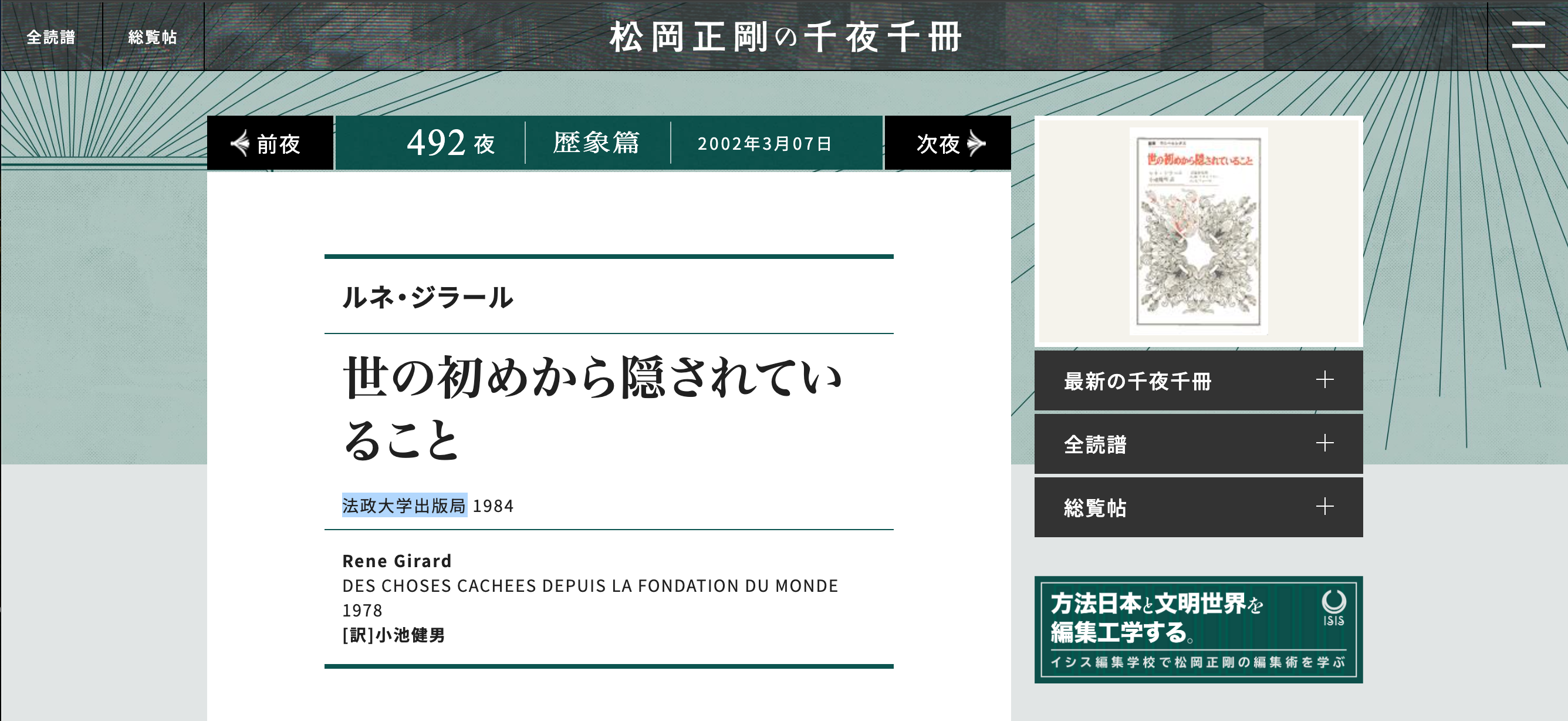 千夜千冊492夜ではルネ・ジラール『世の初めから隠されていること』(法政大学出版局)が取り上げられている。