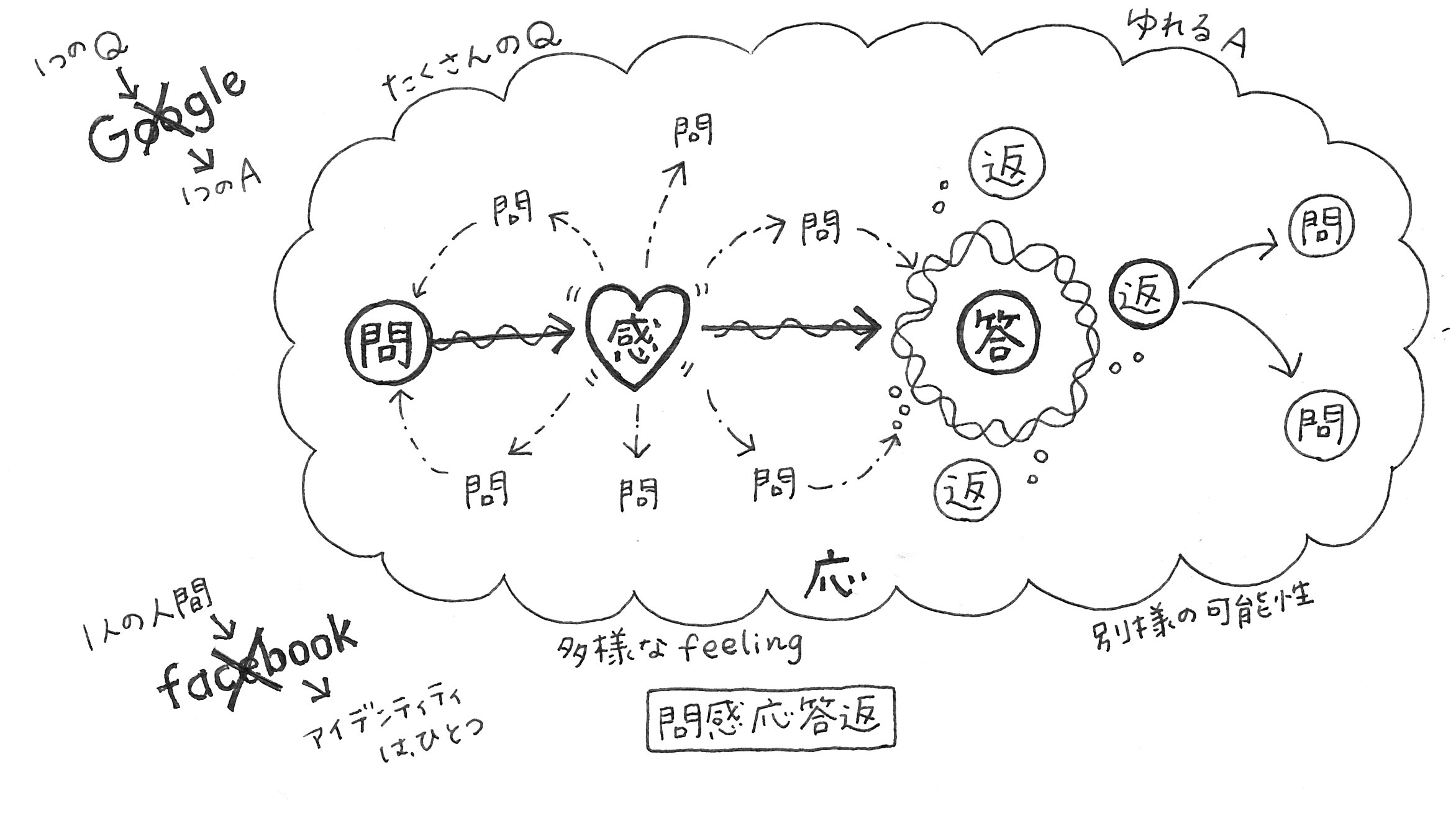 〇か×かの二項対立的な入試問題。問いと答えは一対一。グーグル型の無味乾燥な「問-答」スタイル。これに対抗しつづけることが編集である。「問-答」のアイダに「感-応」を差し込む。そのことで、「返」としての別様の可能性が生まれる。簡単なシェーマにすると以下のような感じになる。