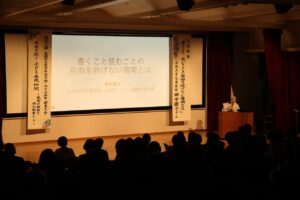 講演のテーマは、『書くこと・読むことの自由を妨げない指南とは』。聴衆は、全国から集まった、作文教育に関心のある小学校や中学校の先生約290名である。