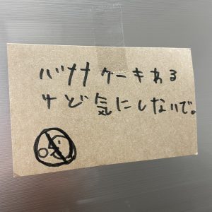 冷蔵庫に貼られた長女のメモ「バナナケーキあるけど気にしないで」。