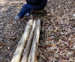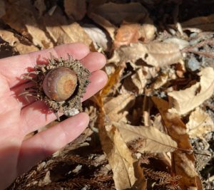 いろんな形のどんぐり、謎の小さな黒い実やキノコがポコポコ飛び出している枯れ木を見つける。