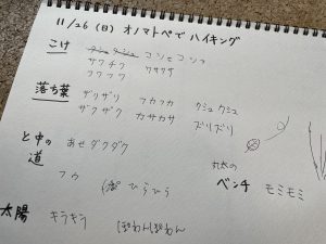 ハイキング中に感じたことをオノマトペで表現して、記録してみたらどうだろう。写真で撮れないものが残せそうだ。ことばが育つには、カラダとつなげることが最初の一歩になるという「子どもイシス」の実践とも重なる。
