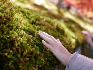 目の高さに苔がある。見た目はフカフカ。触ってみると思ったよりもかたくモサモサしている。