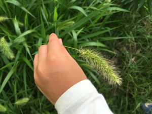 イラストを参考に、原っぱのネコジャラシの実を「収穫」する。すり鉢で皮をむき、風でよりわけ、炒ってポップコーンのようにして食べてみた。