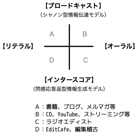 AやBが従来型のパッケージ化された発信形態だとすれば、ISISが向かおうとしているメディア像はCやDの象限にあるだろう。「インタースコア」という概念は、対極に「ブロードキャスト」を置くことによって輪郭が鮮明になるように思う。