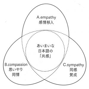 "日常用語の「共感」はCであり、カウンセリングの「共感」はAのエンパシーである。「共感」はBの意味でも受け取られるため「カウンセリングの共感は同情とは異なる」という説明が必要になる"
