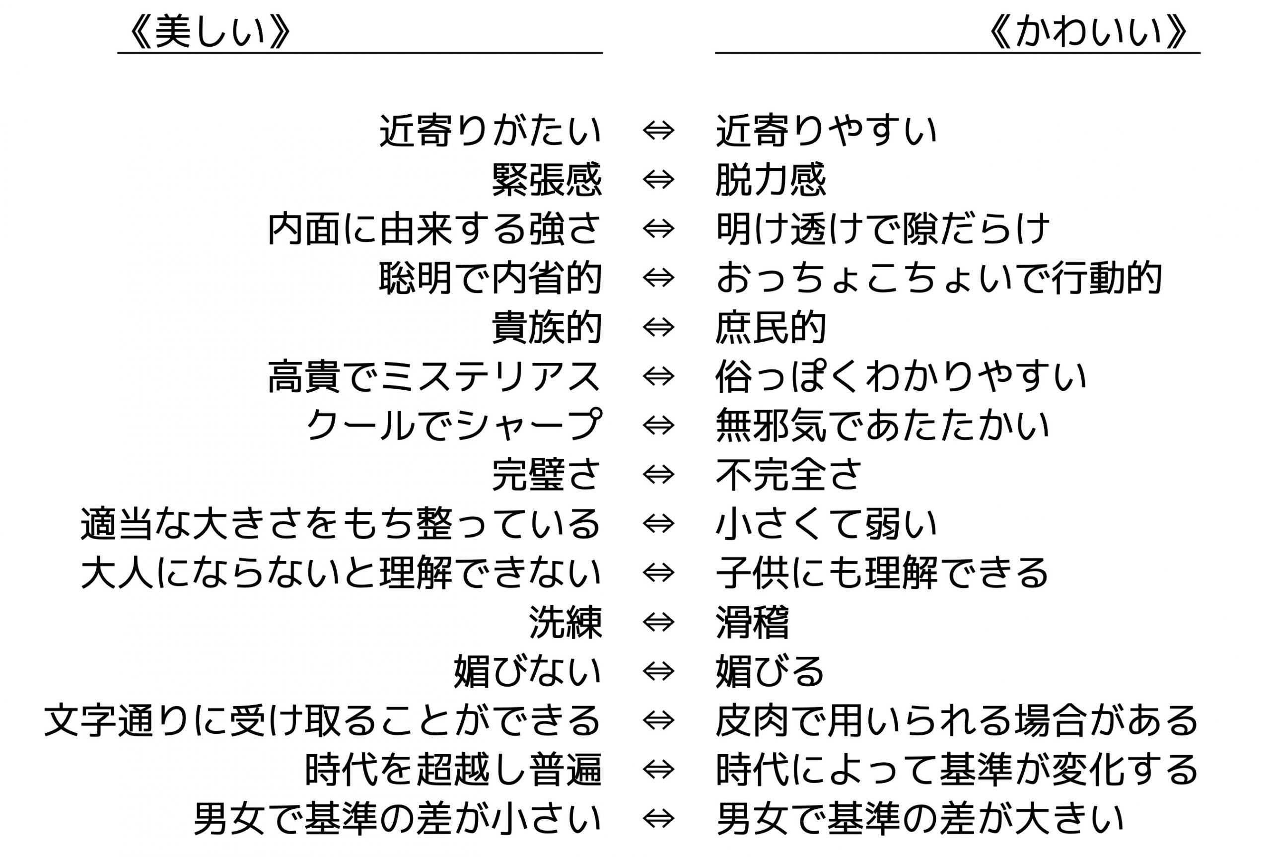 ◆「美」について考えるとき、対概念として「かわいい」を想定することでイメージの特性が浮かび上がって見えてくるだろう。◆「美しい」が西洋の一神教的な完全無欠さを想起させる一方で、「カワイイ」はどこか不完全で、何かしらの欠落を孕んでおり、多神教的な世界観すら感じる。「カワイイ」の多義性には日本的美意識が滲んでいるように見える。