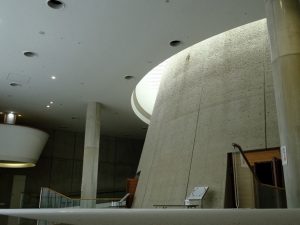 ▼こういう隠し方が東本願寺は本当に粋だと思う。表向きは上手に混ぜて馴染ませるかと思ったら、内側では度肝を抜くような冒険もする。先述の洋館住宅は参拝者からは見えない奥に秘されているし、きわめつけは1998(平成10)年につくられた高松伸の視聴覚ホールである。亀岡末吉の菊門と大寝殿の間、その地中に、巨大なコンクリートの地下神殿が埋められているのだ。こんなものがこんなところにあるとはきっと誰ひとり思わない。懐深く入っていって初めてこのラディカルな空間に出会えるのである。