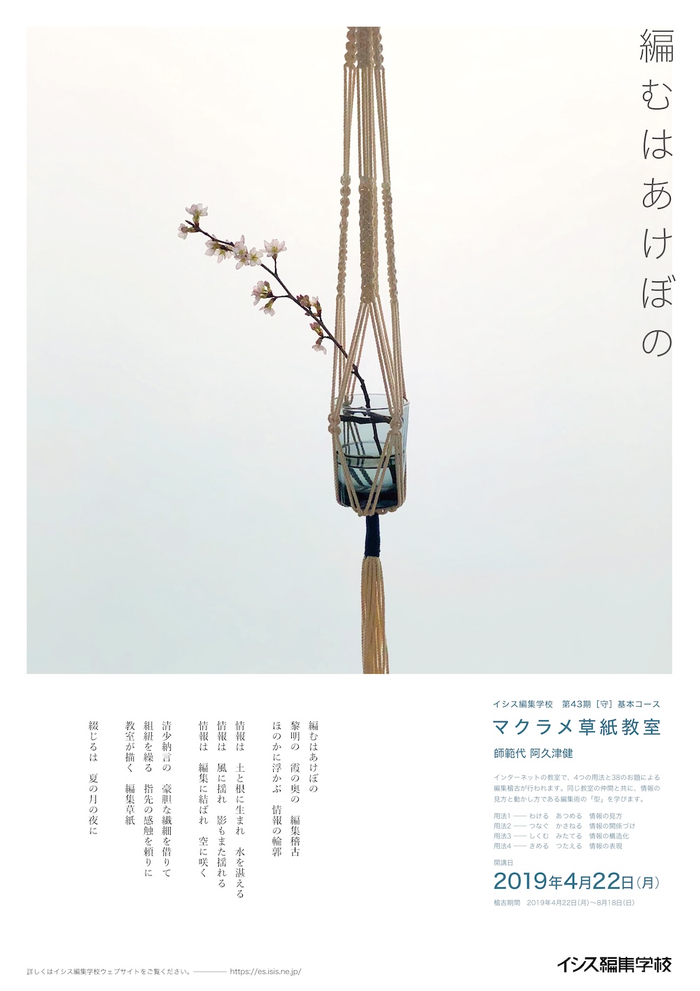 ああ、そうであった。編み込んだ3本以上のロープによって、植木鉢もコップも情報も受け止める「マクラメ・ハンギング・モデル」を、かつての私は校長と一緒に作り上げたはずだったのだ。その人の持つヘンテコな世界モデルを許すのが、松岡校長の作ったイシス編集学校だ。これからも、残された者たちや未来の学衆たちによって、様々な世界モデルが持ち込まれ、発明され、相互に交わり、未詳のマクラメ模様がつくられていく。