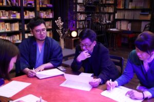 優子宗風を囲み、ブビンガに着席した【EDO風狂連】一同。ここからは、EDO風狂連メンバー(連中)だけが参加する真剣勝負の時間だ。「ひ・ふ・み組」の3グループに分かれた。手元の紙には、各組の持ち歌として「風の短歌」が並んでいる。