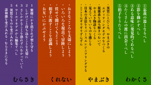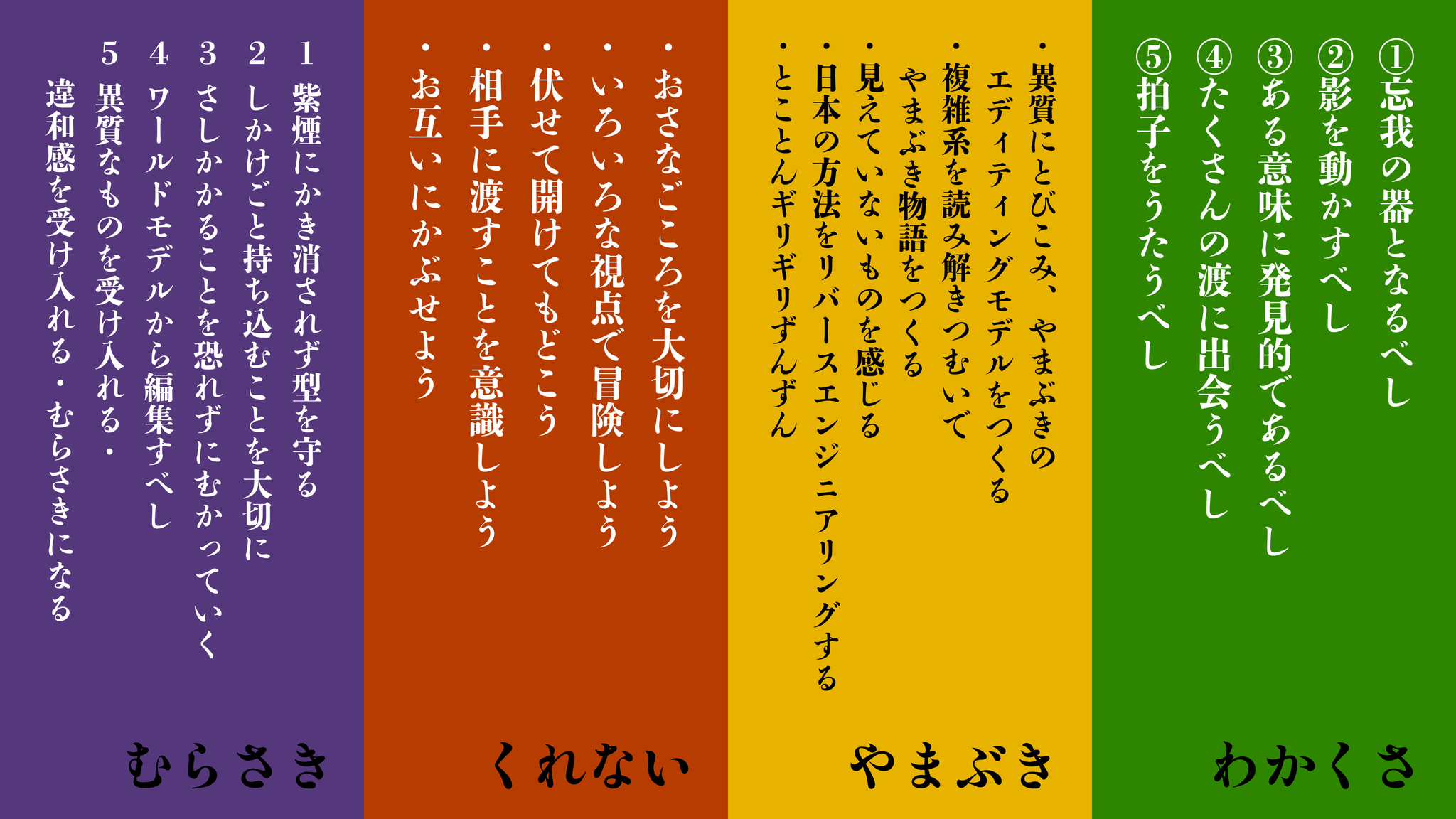 2023.5.13時点の五箇条。道場の色は花の色を表している。式目演習がスタートしても、道場では並行して五箇条の編集が続く。