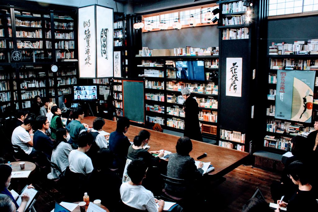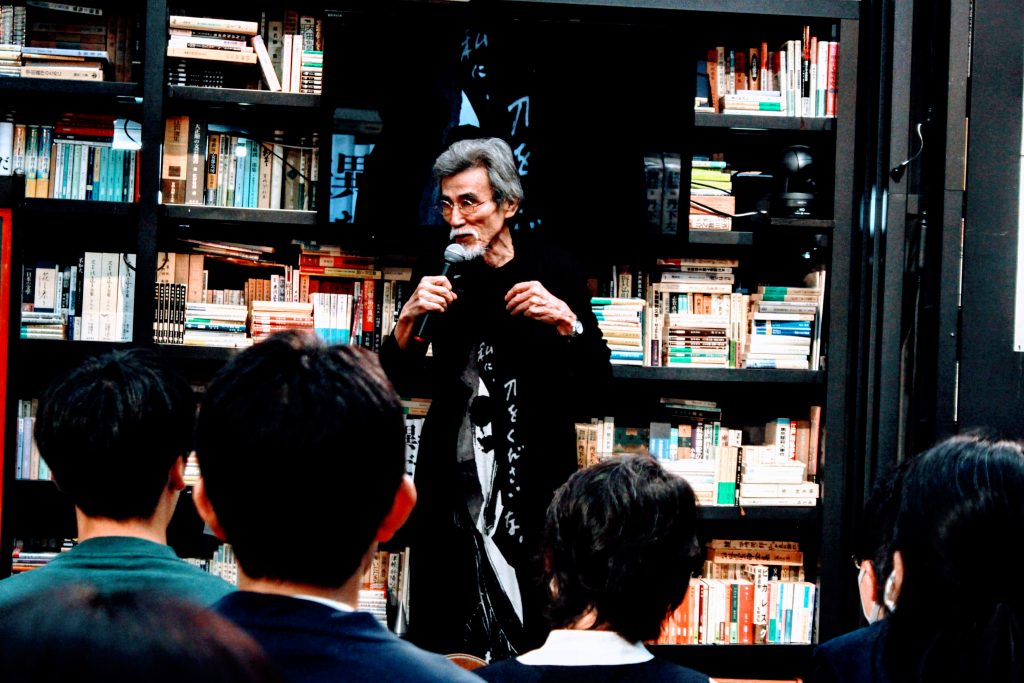 10月28日(土)の入伝式、花伝所所長田中晶子のメッセージが終わると、全身を黒で極めた校長松岡正剛がゆっくりと歩き出した。本楼の背後から4本の柱に囲まれた空間へ。まるで橋掛かりを歩むような校長の姿を入伝生たちはじっと目で追う。至芸の世界観と至極の人間観をあらわした世阿弥の『風姿花伝』、通称『花伝書』に肖った花伝所は、編集的世界観と人間像を膨らませた900名近い師範代を送り出し、この秋、第40期という節目を迎えた。「これは面白いな、ここまでやるのか、この深さを背負ったのか、などと思うような人ばかりです」と校長は感慨を口にし、つぎは君たちの番ですよとばかりに「師範代になるための5つの条件」を語った。