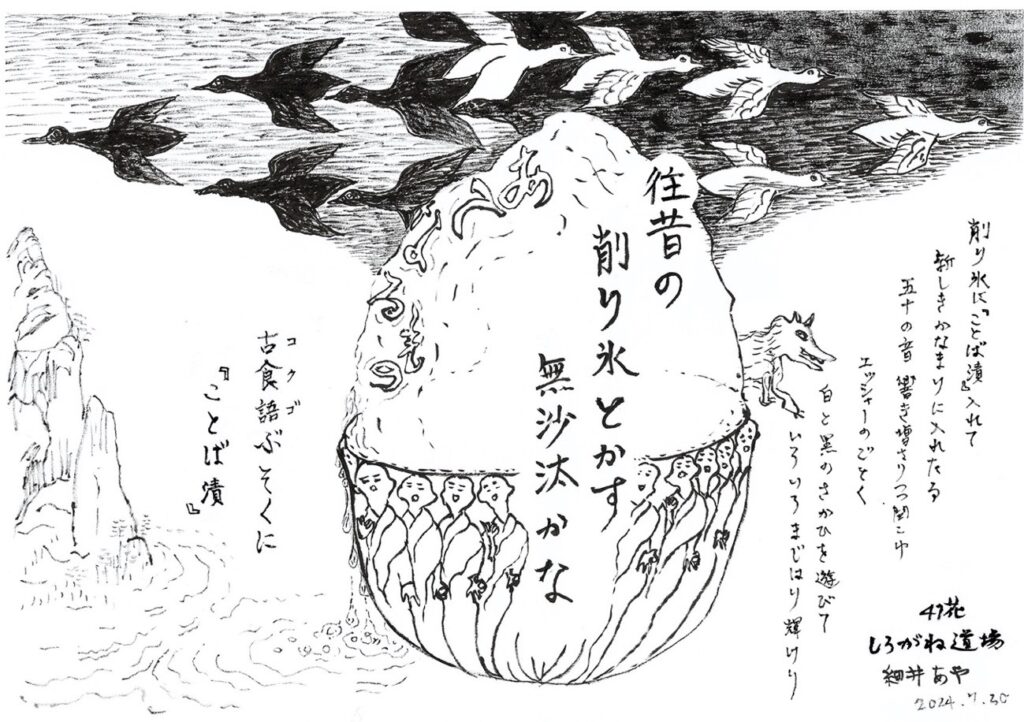 だから、『ことば漬』要約図解のお題も、「語り合うための字と絵」であることが肝心となる。方法はいろいろあり、通じることばも通じないことばもつかってよい。花のつぼみのような秘めた語りも、しろがねの剣のような丁々発止の語りも歓迎される。ここでは、知識の多少や絵図の巧拙はとわれない。その絶対自由があるからこそ、類推や仮説に富んだことば遊び・絵あそびが広がっていく。