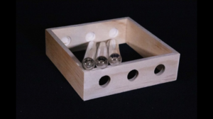 松岡正剛校長が自ら100円ショップに買いに行ったという試験管立てと試験管。木製の枠だけでは何かわからないが、試験官が添えられると既知の情報と結びつく。