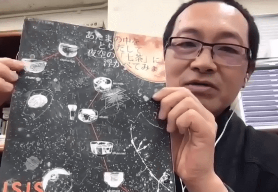 そこで『全宇宙誌』をモチーフにし、そこに7つの茶碗を並べて北斗七星にするデザインに(肖る)。