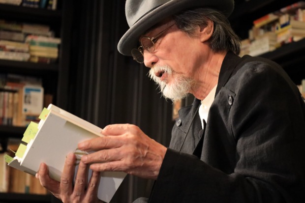 薄墨色のハットを目深にかぶった松岡は、一文ずつ舐めるように音読する。つづいて、その文章に込めた意図を語る。たとえばこうだ。