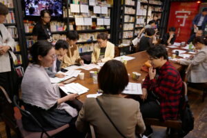 事前課題でみっちりとイメージを広げさせたところで、奥本のレクチャーでぐるりと見方を変え、一気呵成にワークへと持ち込む。用意が尽くされているからこそ、師範代同士の対話が過熱した。奥本と福澤によるコーナーの仕立てそのものが、師範代に外部性を取り込ませ、教室をカオスで見るための骨法をつかませる仕掛けだった。