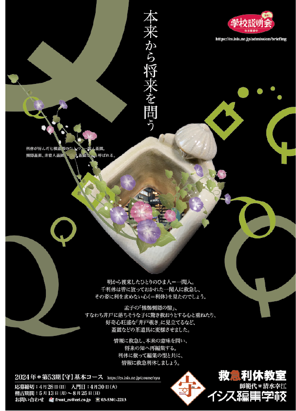 利休といえば茶室の一輪の朝顔を際立たせるために、庭の朝顔を全て切り落としましたが、救急利休では教室中にお題に恋する朝顔が咲き乱れました。