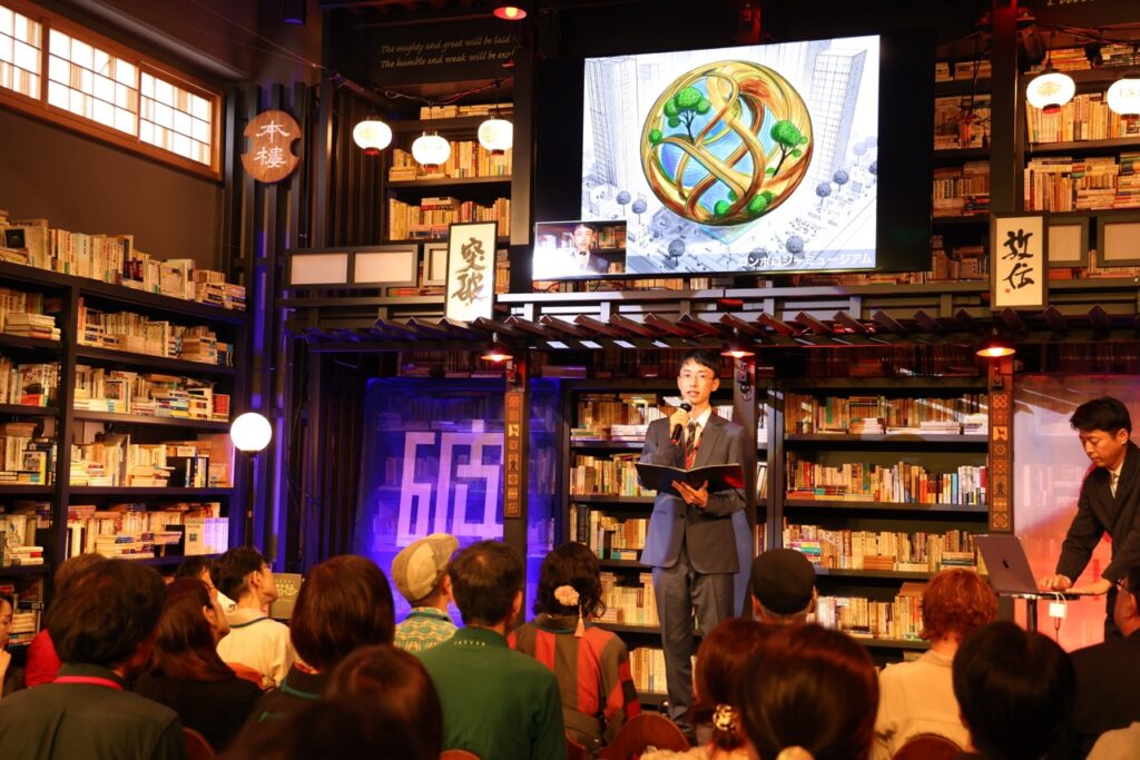 審査員を務めた九天玄氣組の中村師範、川崎師範、植田師範が合議によりグランプリに選んだのは、佐藤さんのbrand-νseum。感想を聞かれ、思わず言葉に詰まった佐藤さんの姿が喜びの大きさを感じさせた。中村師範からは、グランプリ作品名とともに、作品の出来栄えは僅差であり、審査員の評価が3つに割れたことが告げられ、川崎師範からは、「ブランコ」の神や宇宙を感じさせる点への評価が語られた。さらに、植田師範からは、より研ぎ澄ますために、プランニング編集の「よもがせわほり」の「よ」である「与件の整理」をもっとしっかりとやった方がよいという辛口のコメントも贈られた。