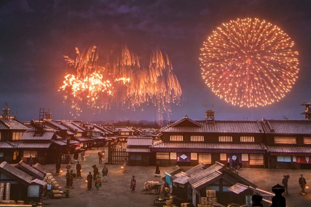 いつしか江戸の町に迷ひ入りたるか、蔦屋耕書堂の店前に立てり。ときに重三郎なる者はをらねど、商ひの繁盛はうかがはれたり。日本橋の空に花火が打ち揚がりて宴に興じたる町を照らし出せり。かくて栄華乃夢噺は醒めやらず、今また蔦重的なる者が空を見上げてポンと膝を打つを、雲の流れて出づる月に願はんとす。