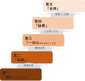 「詠歌」によって「一向心」の所欲は鎮静化され、「時」に適応することができるようになる。第五段階の「全時」である。言語空間を突き破ってくるもの、それが言霊だ。言霊というのはいつの時代でも世界を回転させる力を持つ言葉であって永遠に作動するものなのである。